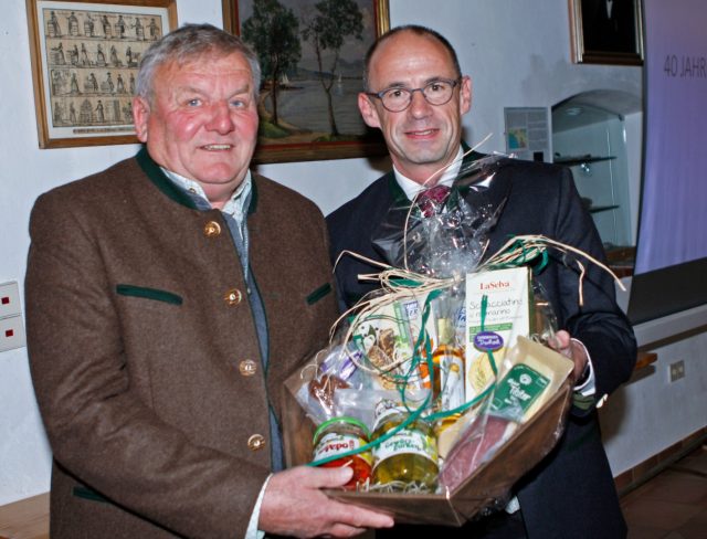 Florian Seestaller betonte, was in den letzten vierzig Jahren passiert sei. „Im Zeitraum, die etwa die Hälfte der Lebenszeit eines Apfelbaumes ist, gab es zehn Neuwahlen und es wurde vierzigmal gesät, gepflanzt und geerntet.“ Seit 1982 habe sich das Profil des Obst- und Gartenbauvereins gewandelt. Zunächst bestand der Schwerpunkt im Obstanbau der Landwirte mit dem Obstverkauf. Danach entwickelten sich Blumenschmuckwettbewerbe an Häusern, schließlich wurde die Selbstversorgung von Obst und Gemüse bei Privatpersonen forciert „und irgendwann kam auch die Jugendbewegung in Schwung – nicht nur Erwachsene, sondern auch Kinder und Jugendliche wurden in die Tätigkeiten des Gartenbauvereins integriert“, so Seestaller. „So prägt die Tätigkeit des Gartenbauvereins das Erscheinungsbild eines Dorfes ungemein und in verschiedenen Formen.“ Als Geschenk überreichte Florian Seestaller an Josef Wiesholler die Jubiläumsschrift „125 Jahre Landesverband der bayerischen Gartenbauvereine“ aus dem Jahr 2019.
